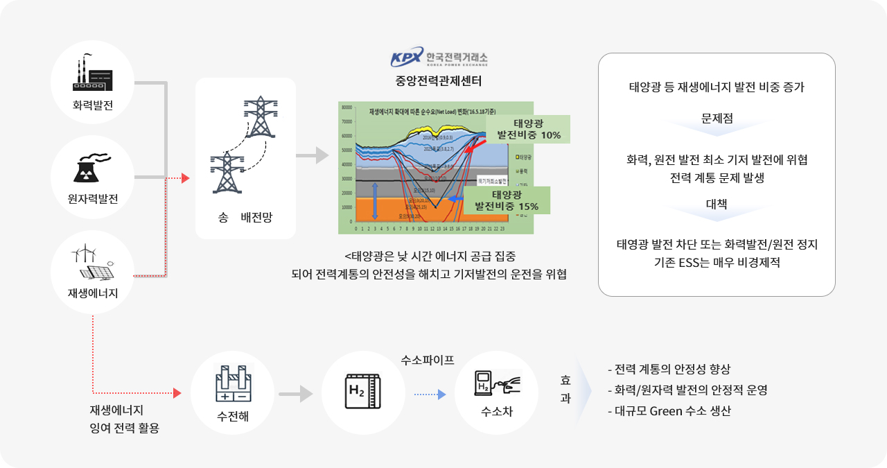 - 태양광, 풍력 등 재생에너지 출력으로 물을 전기분해(수전해)하여 수소를 생산·저장하는 시스템